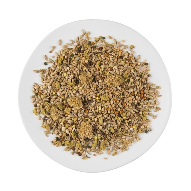 Sastāvs: sēklas (2% lūksnes prosa, 3% zālāju sēklas, 2% burkānu sēklas, 2% kress), dārzeņu atvasinājumi, graudi, minerāli, dārzeņi, eļļas un tauki, olas un olu produkti 0,3%.