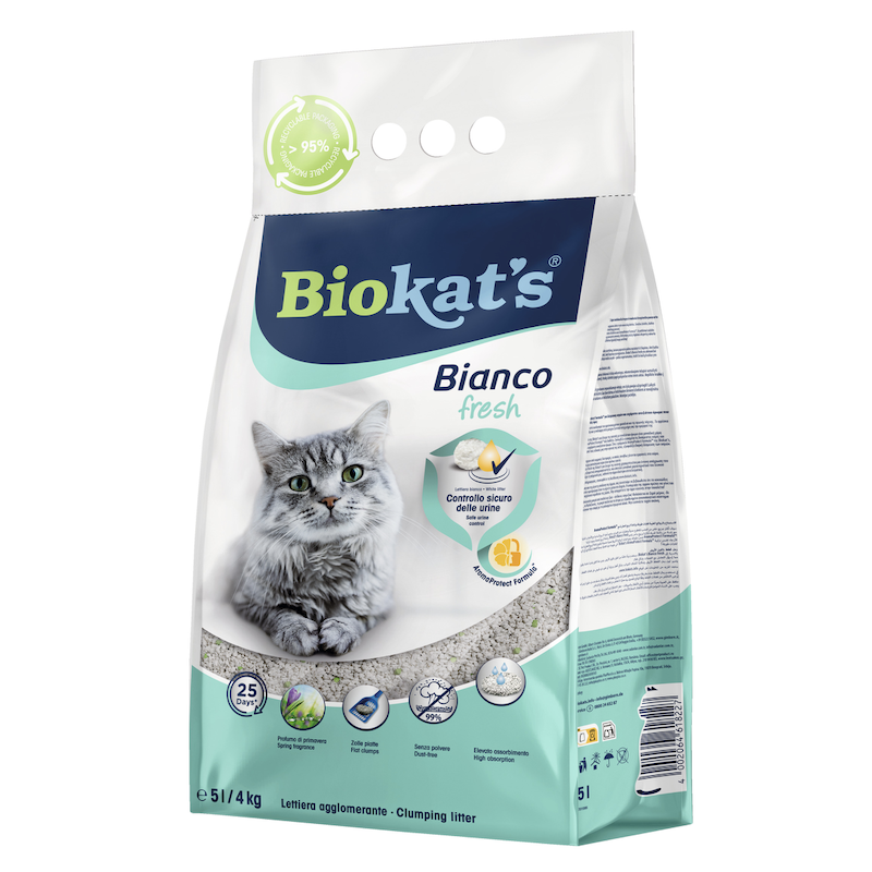 Ļaujiet sevi apburt īpašajai svaigi nopļautas zāles un rīta rasas pilienu kombinācijai. Svaigi garšaugi, balti ziedi un viegls muskusa pieskāriens atgādina par burvīgu pavasari. Biokat’s Bianco fresh ar pavasara aromātu izceļas ar AromaProtect Formula™. Tā uzticami aiztur nepatīkamas smakas un izdala patīkamo pavasara aromātu. Biokat’s AromaProtect Formula™, ko izstrādājuši mūsu kaķu higiēnas eksperti, nodrošina ilgstošu smaku neitralizāciju!
